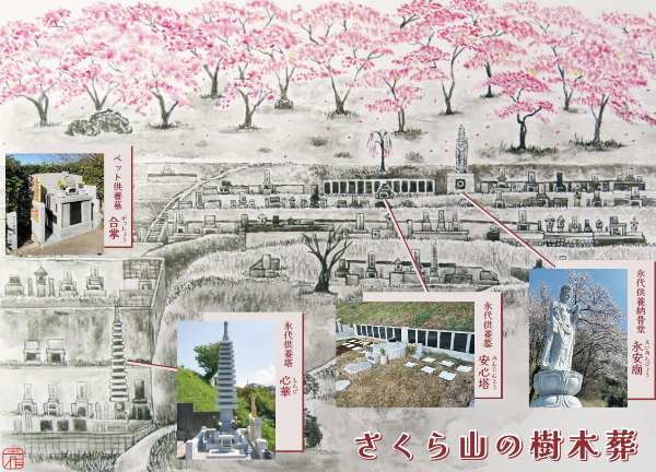 さくら山を背にした墓域のすべてが、桜やツツジなどの花や樹木に包まれた樹木葬墓地となっています。